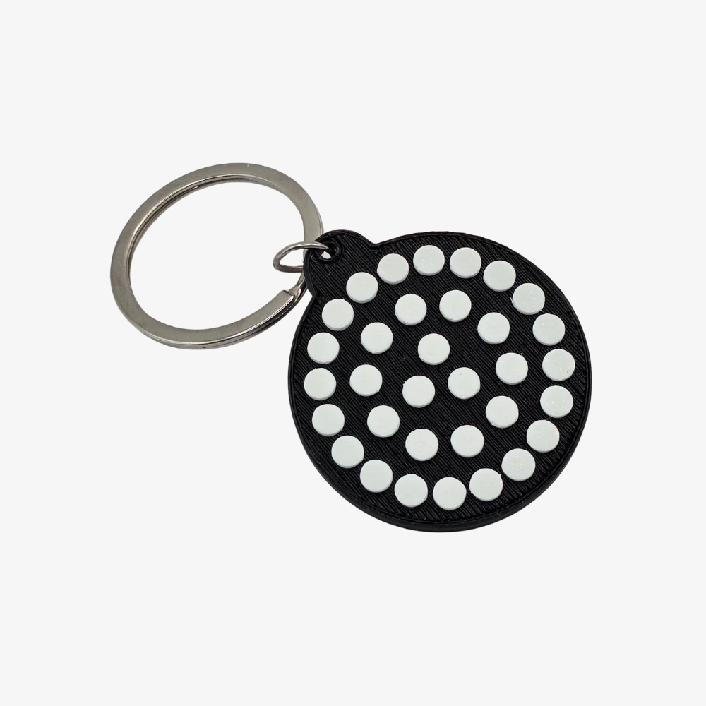 One side of this keychain shows the engine configuration of the Superheavy Booster and the other side shows the engine configuration of the Starship Upper Stage.